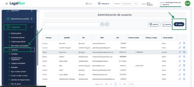 Para crear un nuevo usuario, hacé click en el botón “+ Nuevo” que se señala en la captura.