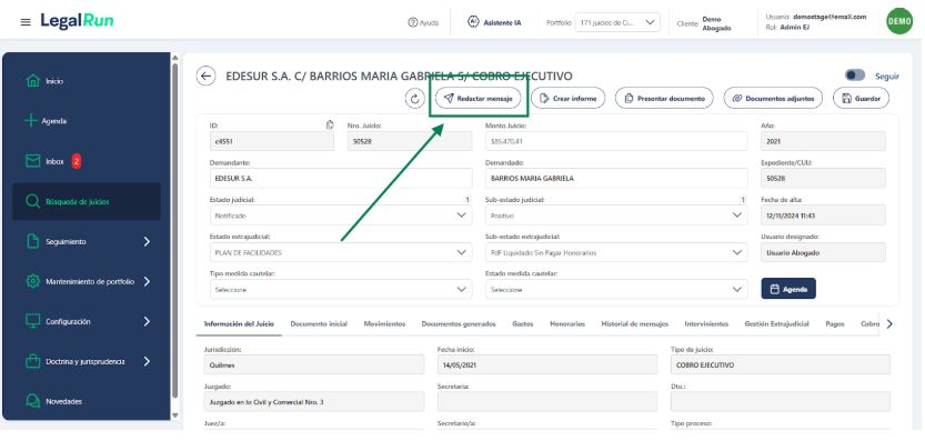 Para enviar un mensaje, ingresá a la Ficha de Juicio → Redactar Mensaje