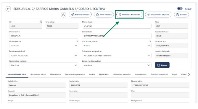 Desde la Ficha de Juicio, hacé clic en Presentar documento