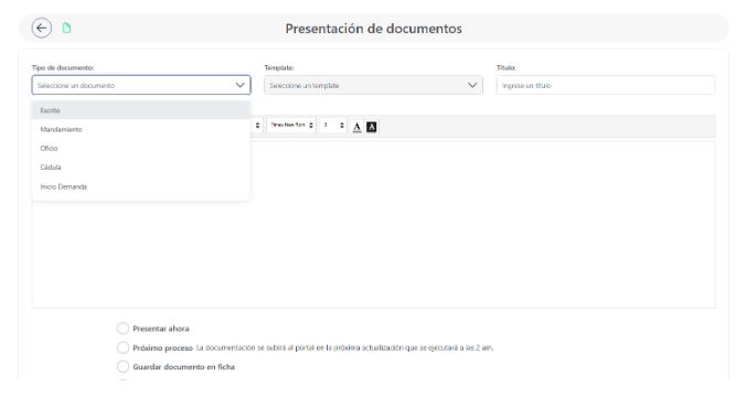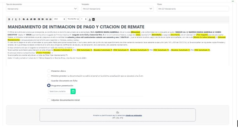 Si seleccionás un template, el sistema completará automáticamente el contenido con los datos del juicio.