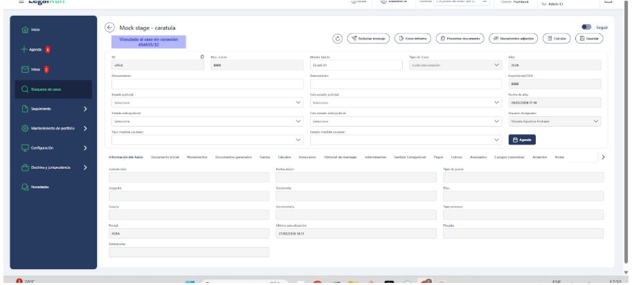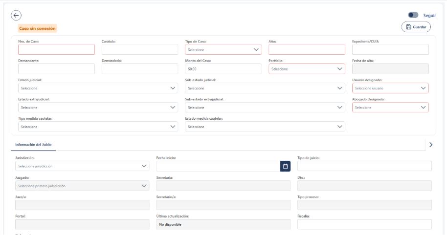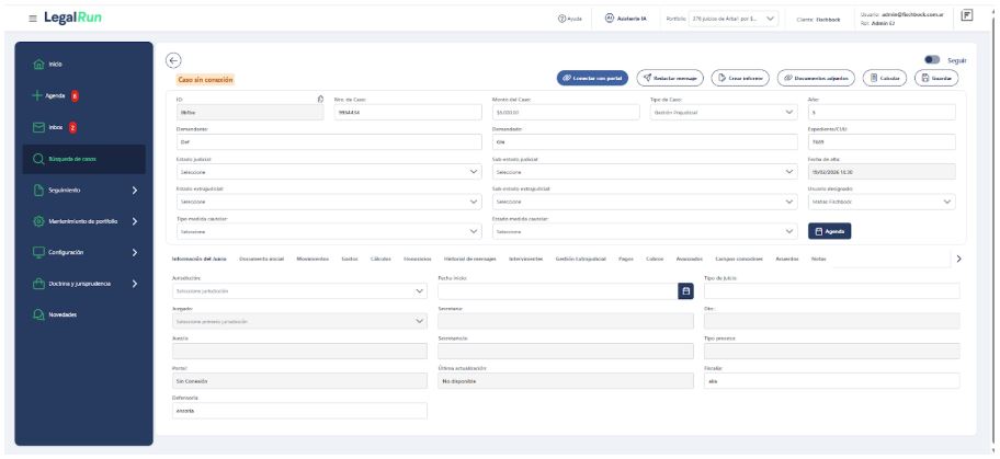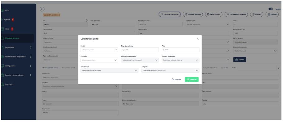 Si el caso comenzó como un caso sin conexión, pero luego se inició la causa en uno de los portales con los que LegalRun está conectado (PJN, SCBA, EJE y SIMP), podés fácilmente conectarlo sin perder el trabajo previo