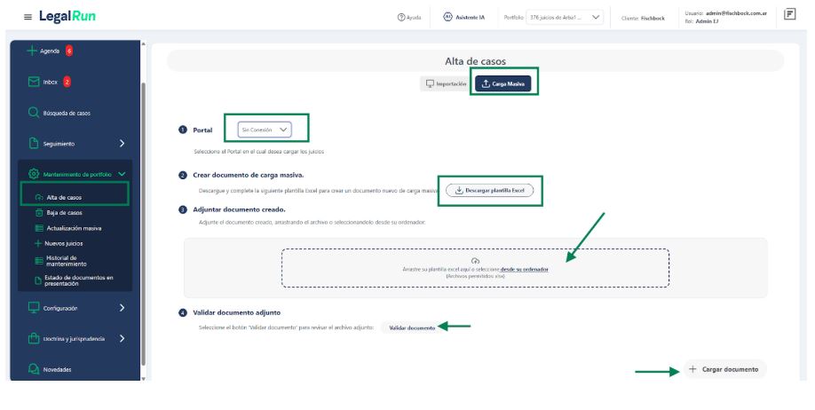 Desde el perfil administrador, dirígete a “Mantenimiento de Portfolio” → “Alta de Casos” y seleccioná “Carga Masiva”. Allí elegí el portal “Sin conexión” y descargá este documento: template_inicio SIN CONEXIÓN.xlsx