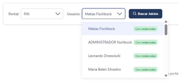 Una vez allí, seleccioná el portal y el usuario. LegalRun te dará aviso sobre los usuarios que tienen credenciales correctamente cargadas para realizar el proceso.