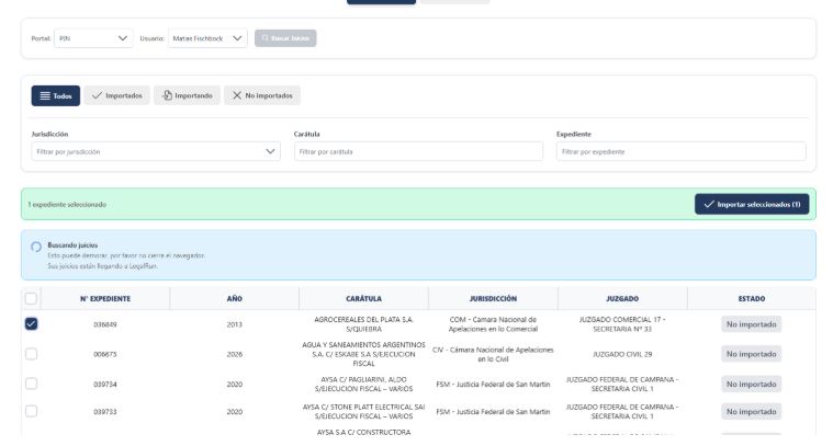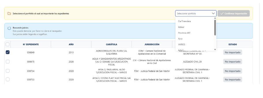 Una vez que hagas clic en “Importar”, LegalRun te solicitará que selecciones el Portfolio al cuál querés vincular esa causa.