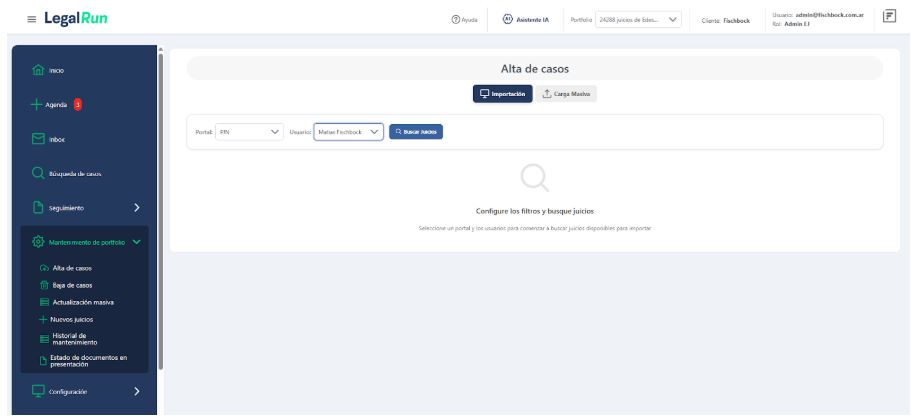 Desde el perfil administrador, dirígete a “Mantenimiento de Portfolio” → “Alta de Casos” y seleccioná “Importación”.
